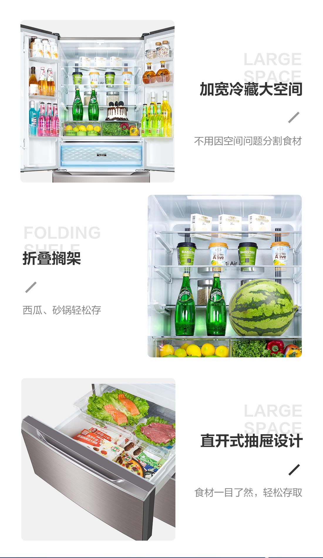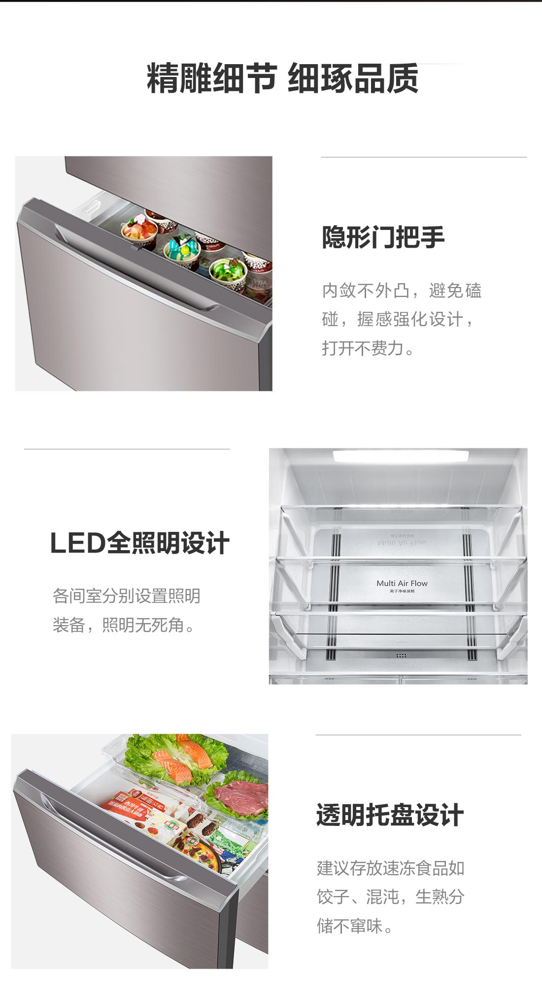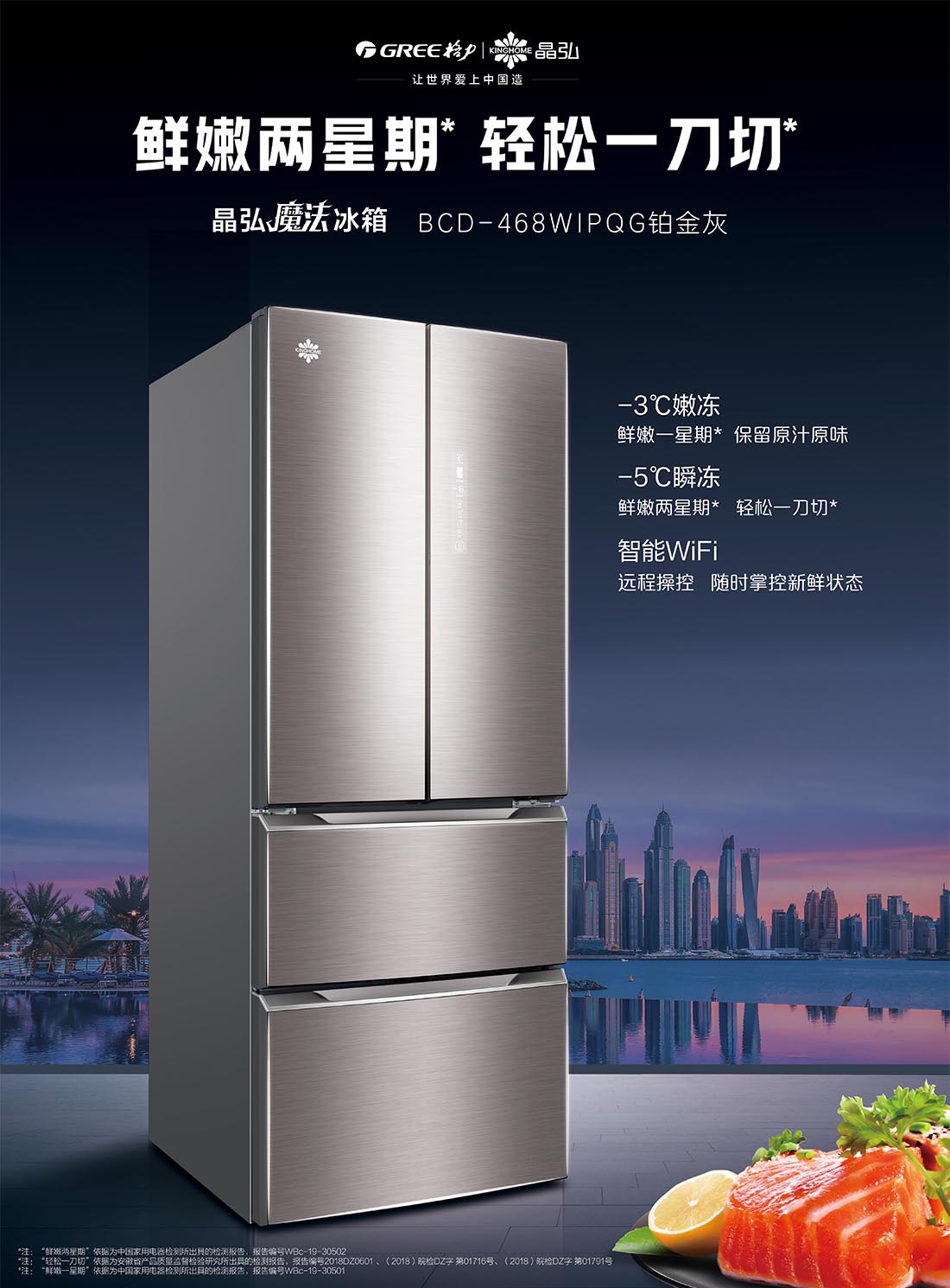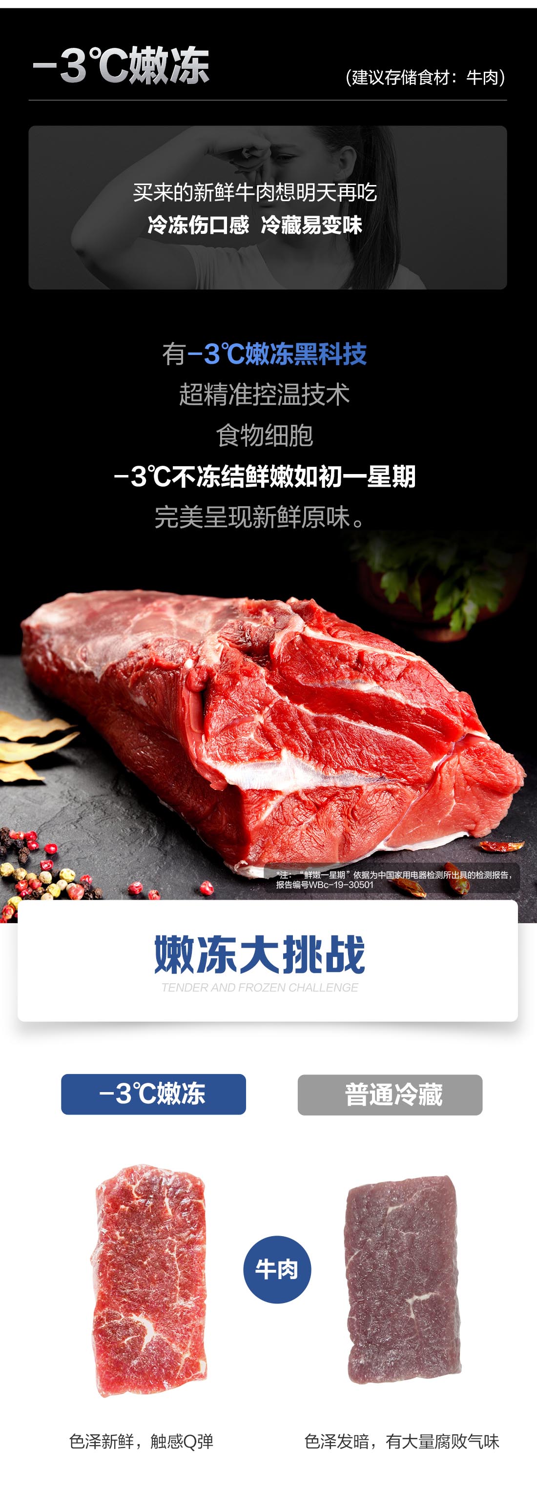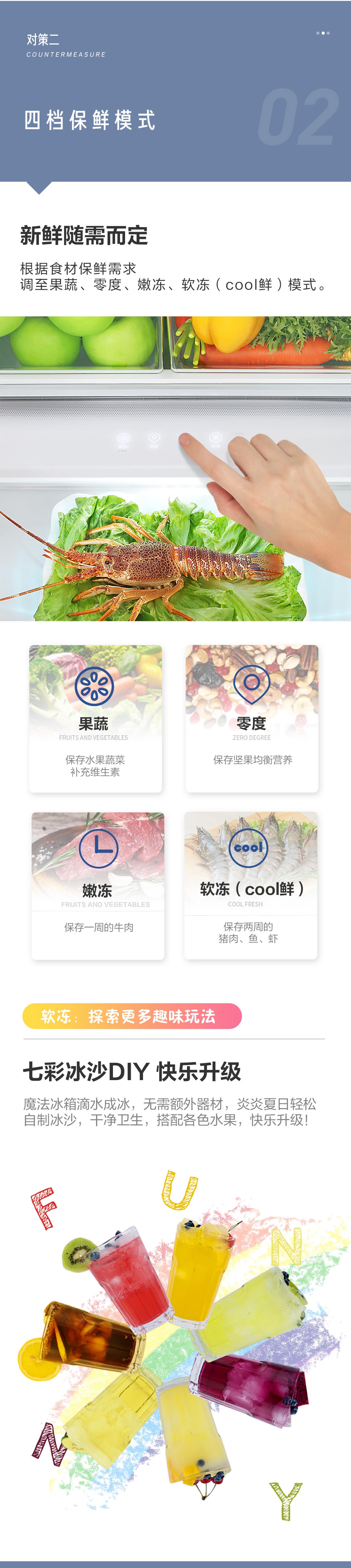 搭载-5℃瞬冻黑科技,鲜嫩两星期,轻松一刀切。细胞级养鲜,营养流失少。搭载-3℃嫩冻黑科技,食材不结冰,鲜嫩一整周。智能全变频技术,恒温保鲜,节能静音。
