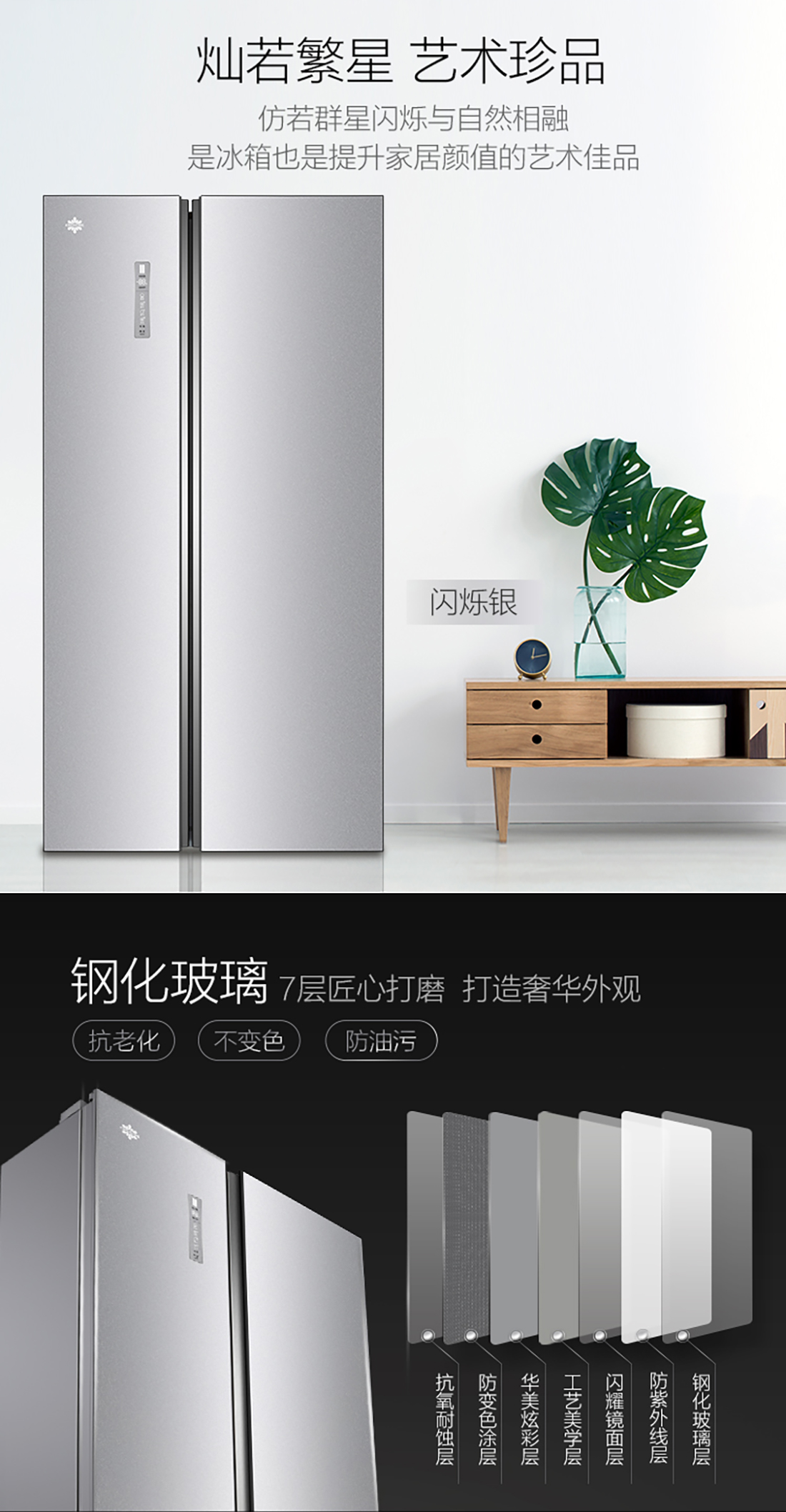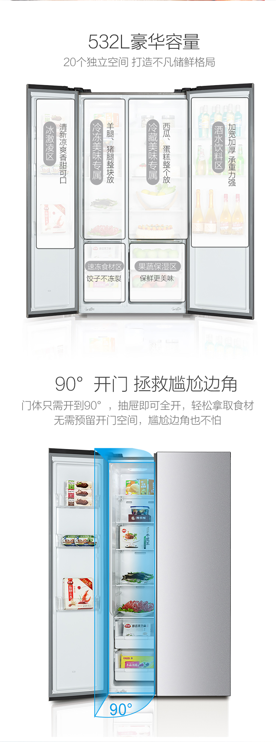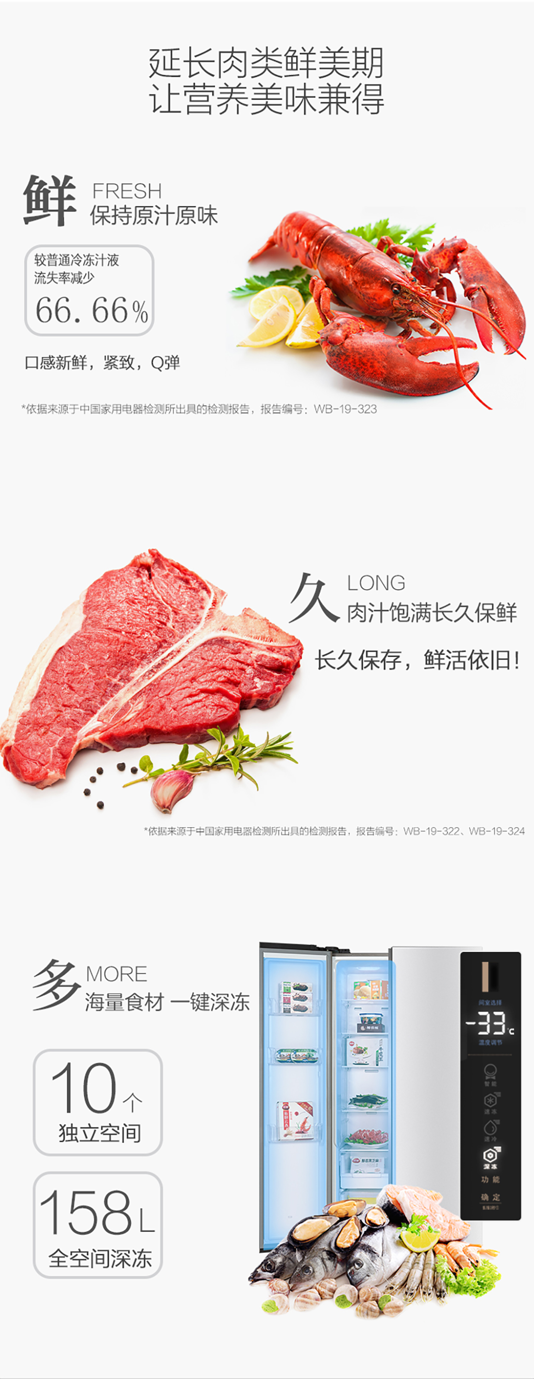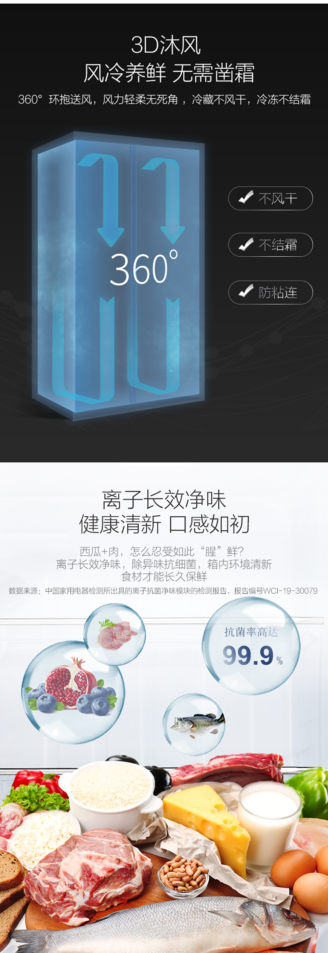 搭载-33℃深冻锁鲜科技,肉汁饱满更长久。采用离子长效抗菌净味,抗菌率高达99.9%。3D沐风,风冷养鲜,无需凿霜。