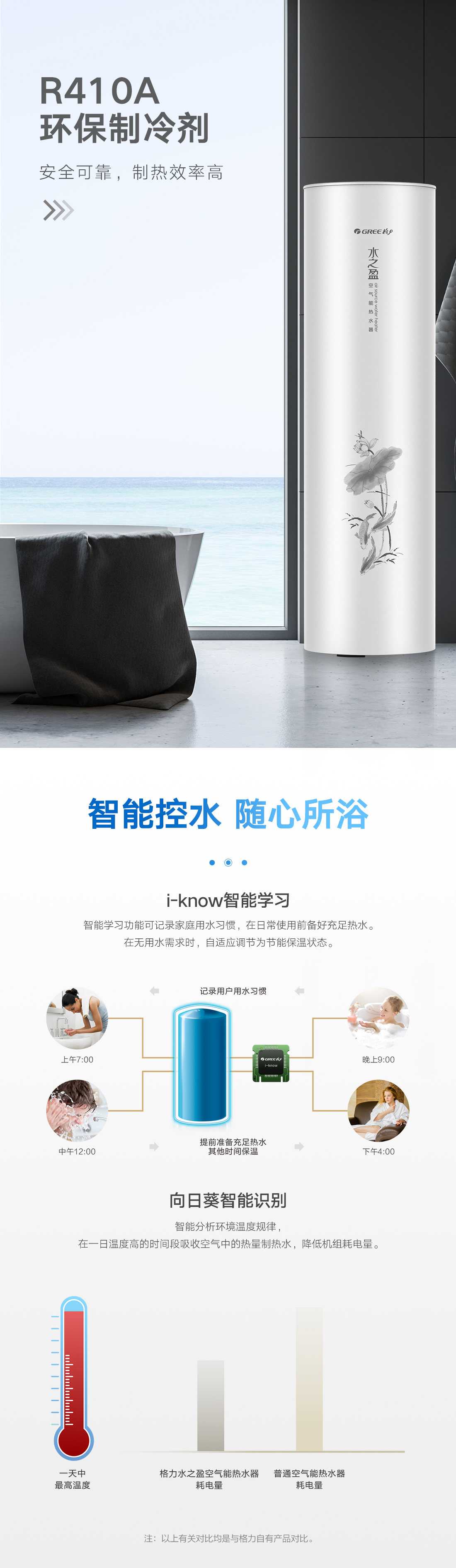 新型环保冷媒,绿色节能更高效,内置增容、向日葵、i-know等个性化功能;给您的沐浴带来多样化体验