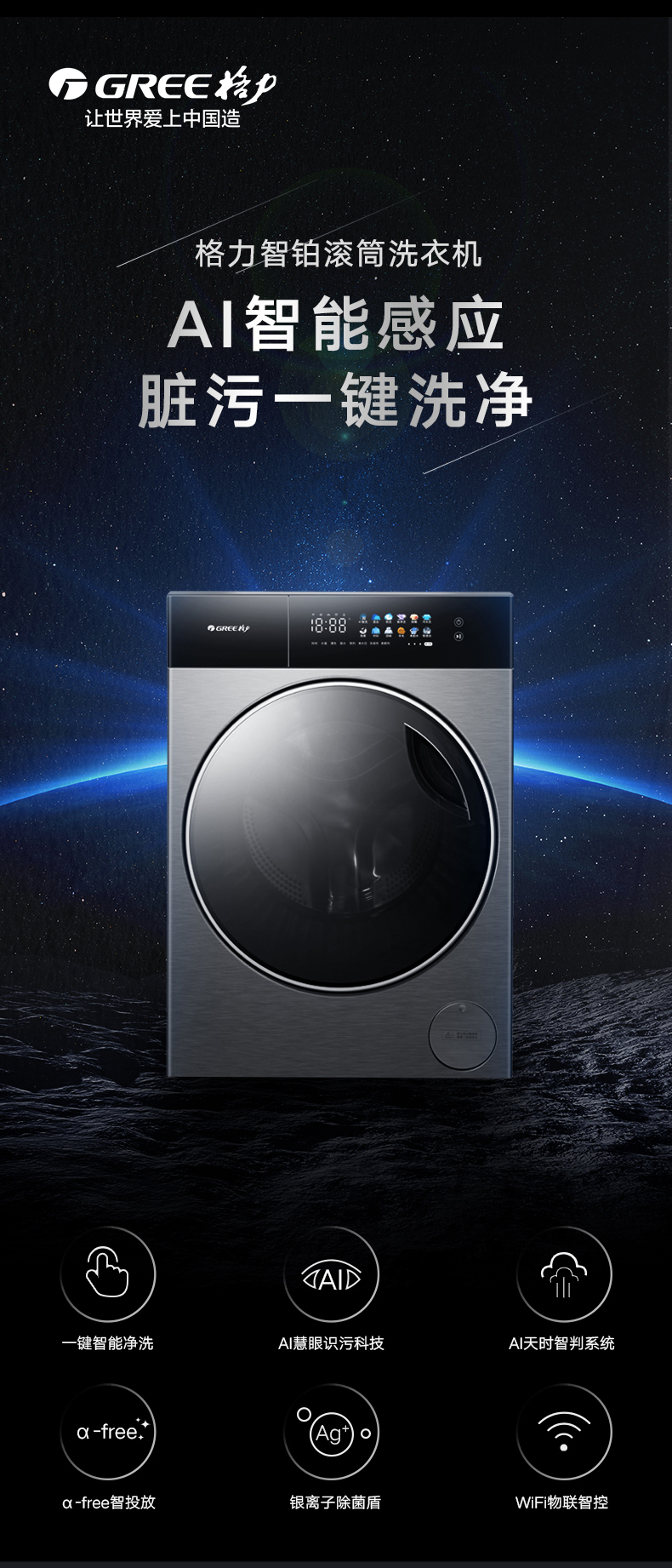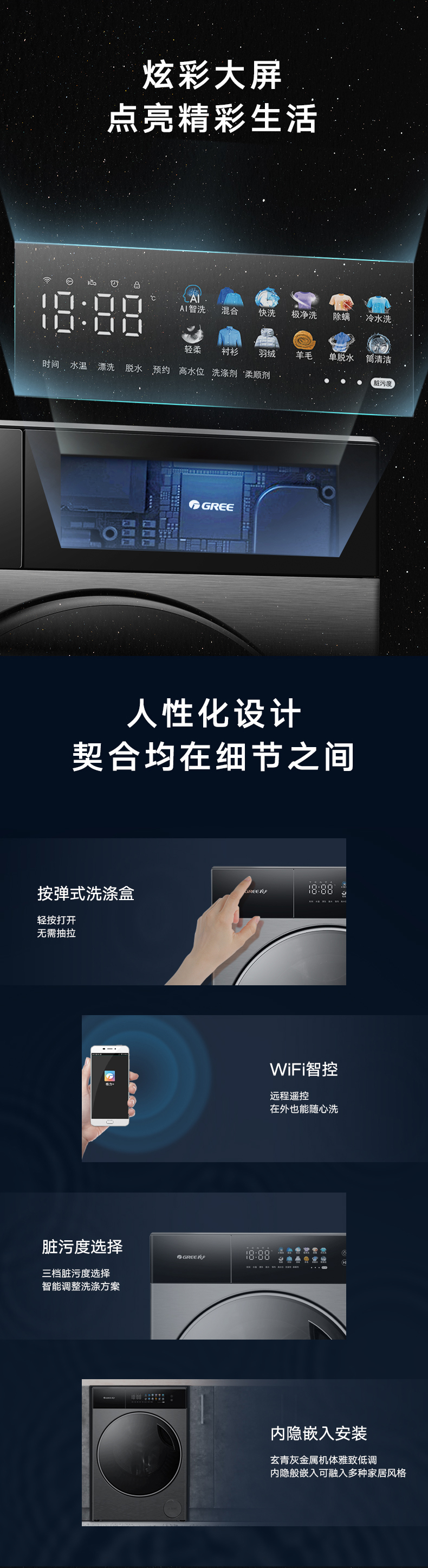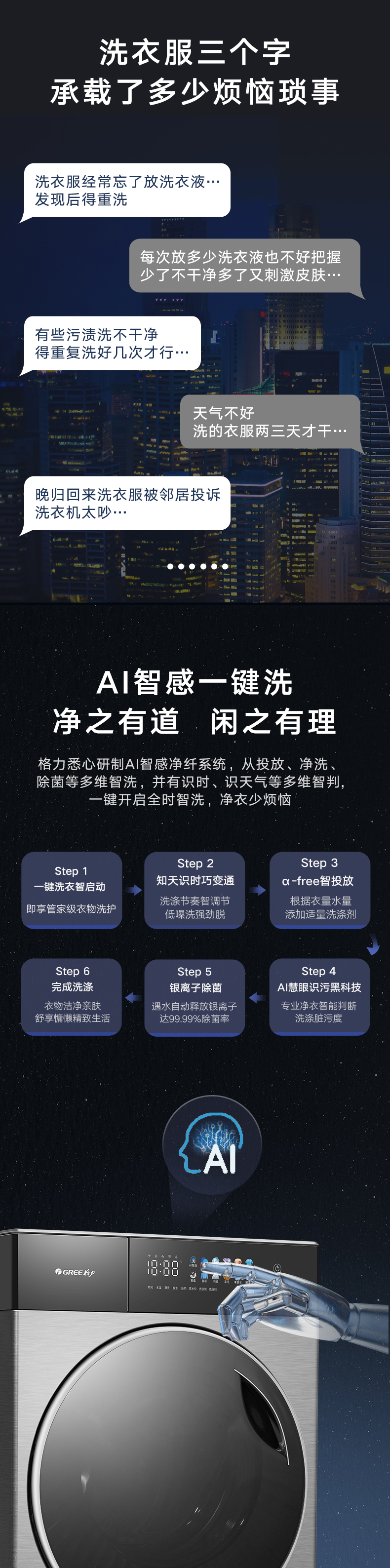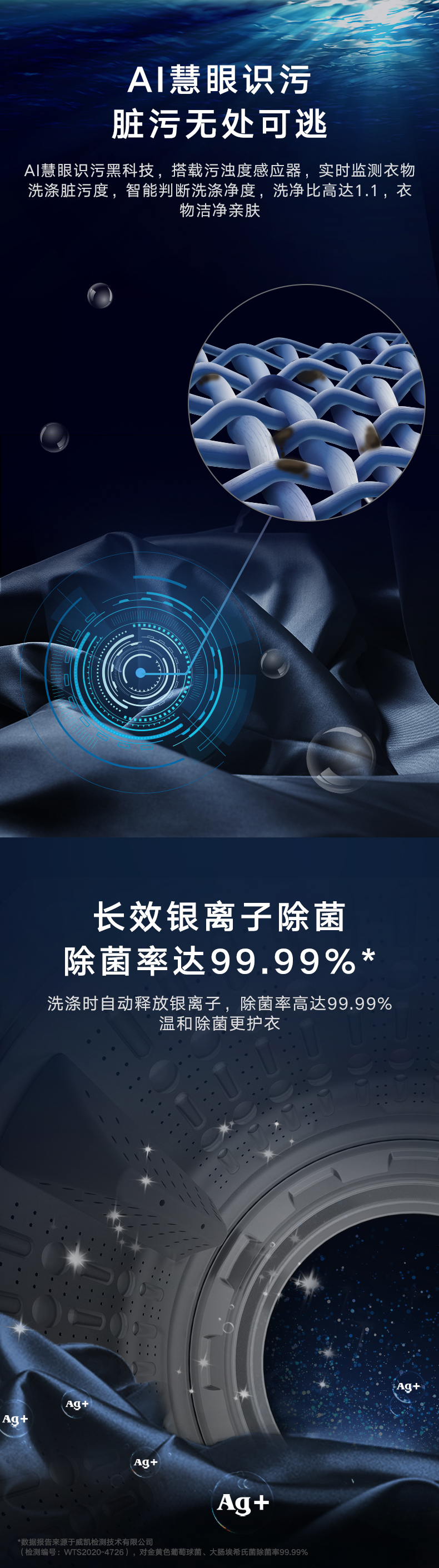 AI智能感应,脏污一键洗净。AI慧眼识污,智能判断洗涤净度,洗净比高达1.1